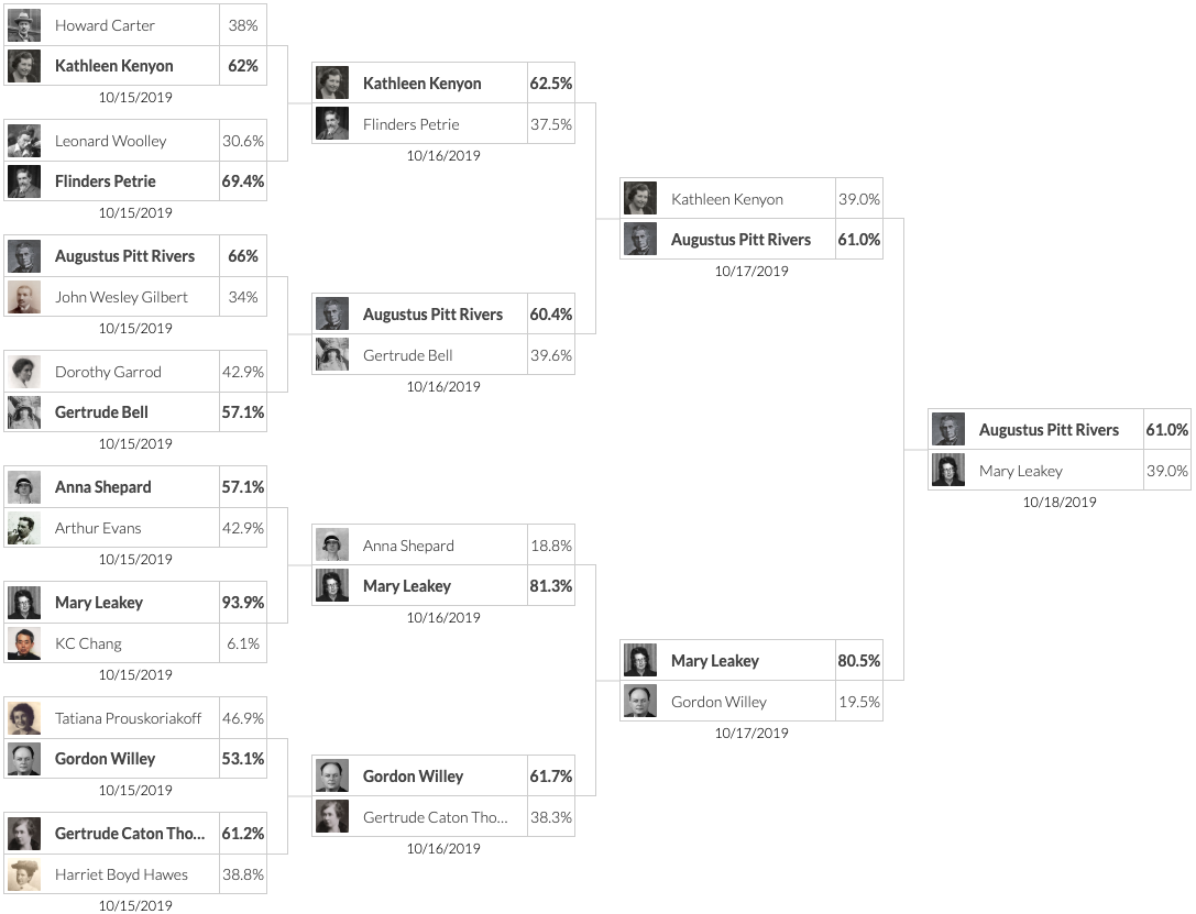 In ArchaeoMadness 2019, 16 archaeologists entered the tournament in a single elimination bracket. Each day participants voted for their favorite archaeologist in head-to-head competitions between two individuals. The winning archaeologist from each matchup moved on to the next round. This was repeated in each round until the championship.