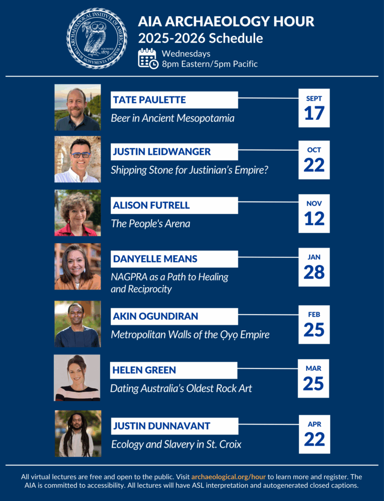 The AIA is pleased to present its 130th National Lecture Program, running from September 2025 through April 2026. Top scholars from North America and abroad are presenting a wide range of current archaeological topics and, as always, lectures are free to the public—everyone is welcome to attend.