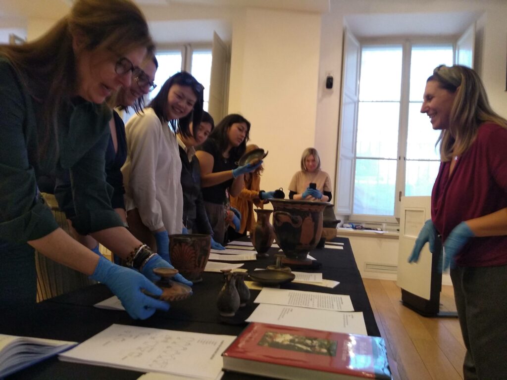 In the other room, Professor Follo showcased a selection of original Greek vases from the American Academy in Rome’s Archaeological Study Collection. She provided insights into their function, craftsmanship, dating, and iconography. Written descriptions accompanied the vases for independent study, and under Professor Follo’s supervision, participants were also invited to hold, touch, and examine these pieces firsthand.