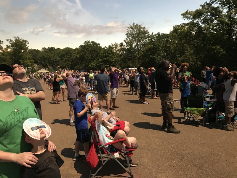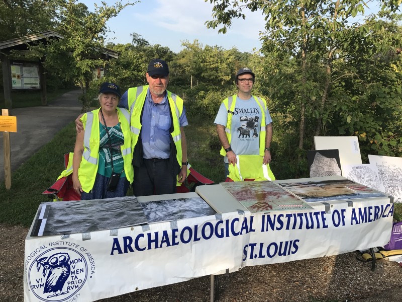 The AIA-St. Louis Society held their first meeting of Fall 2017 during the solar eclipse at the highly significant rock art site (23WA1) inside of Washington State Park near DeSoto, Missouri. Bill Mayberry, naturalist for Missouri State Parks, led a tour of the petroglyph site while Michael Fuller, Neathery Fuller, and Eric Fuller discussed the possible association of one panel with solar eclipses. Over 2,000 visitors were at the park to witness the total solar eclipse that occurred at 1:16 pm. Many of visitors stopped to talk with the team from AIA-St. Louis Society. Special permission for close-up study and photography of the petroglyphs during the eclipse was granted to Professor Michael Fuller by Missouri State Parks. The eclipse was spectacular, new discoveries were made studying the petroglyphs, and over a 1,000 members and visitors learned about archaeoastronomy.