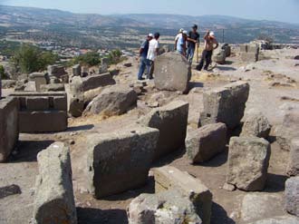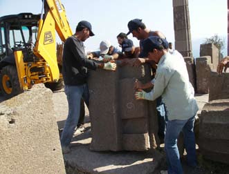 - Thanks to the community of Behramkale,which provided a construction vehicle, it was possible to begin reorganization of the entire archaeological site. Concrete blocks lying on the Acropolis since the last restoration were removed and many architectural members of the temple were transported to a suitable place. The largest and most significant cornice blocks were rearranged on the foundations of the cella.