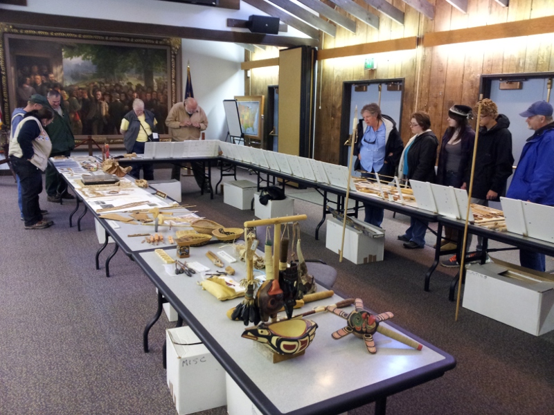 The Traveling Museum of Oregon Prehistory consists of replica and reproduction artifacts reflecting cultural adaptations to the ecological zones that overlap Oregon: NW Coast, Columbia Plateau, Inter-Mountain, Great Basin, and California. Emphasis is placed on the hunting, fishing, and domestic aspects of life. The museum’s artifacts illustrate the technological solutions and cleverness of native peoples. Features include stone, bone, wood, shell, fiber, sinew, etc. There were also demonstrations of atlatl and darts, compound arrow, bow drill, spindle drill, micro-drill, rattles, bull roarer, and other items. Discussions centered on dart vs. bow technology, arrow marking as contractual agreements, meat sharing, and the cleverness of technological solutions using local raw materials.