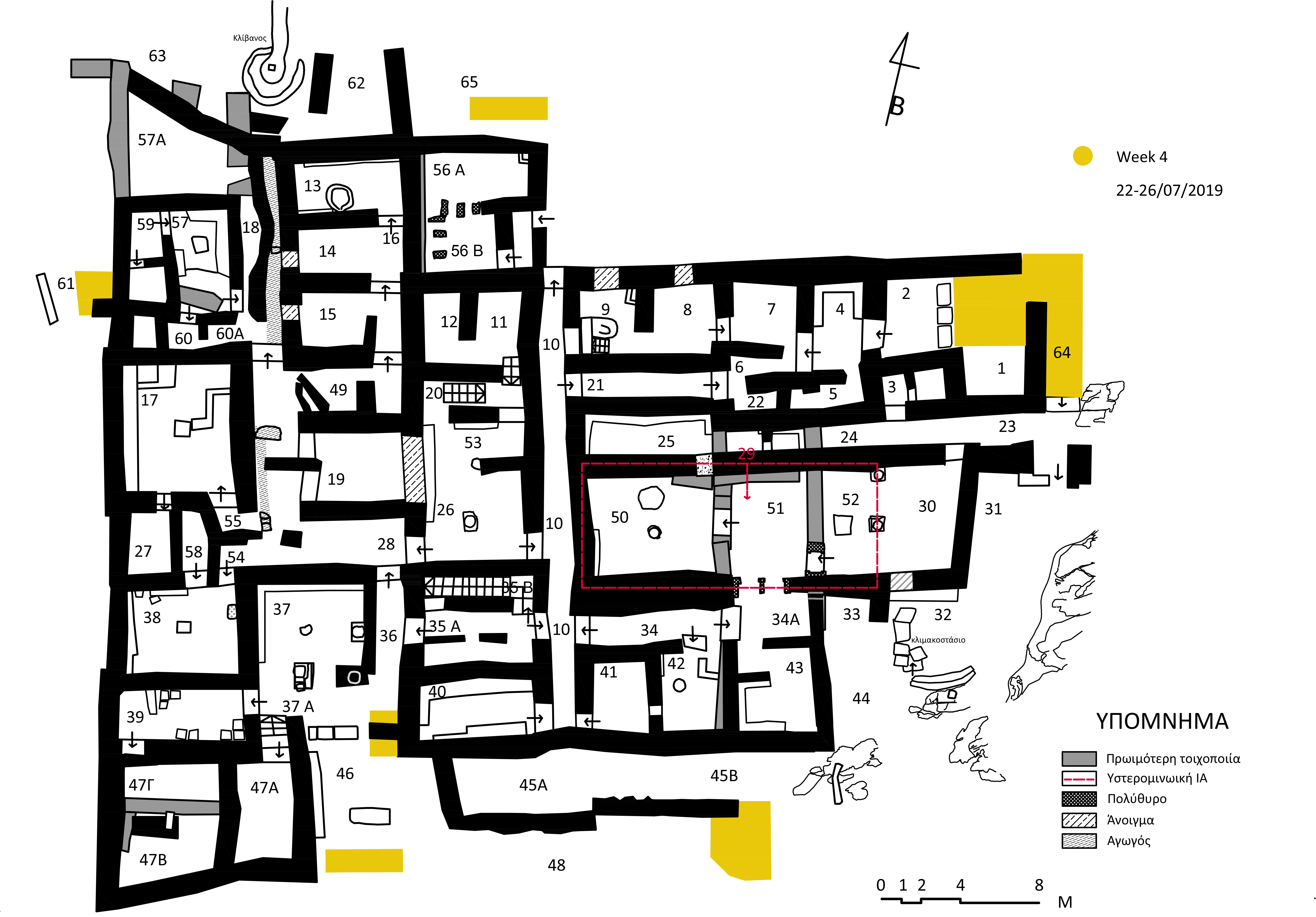 The excavation of Room 64 continues currently at layer 4 (Fig. 1-2). So far, more slabs which cover the bedrock have appeared in different consecutive levels that strongly suggest the existence of a ramp. A large amount of pottery has been collected as well as some intact conical cups (Fig. 3), a fragment of an egg-cup and a rock crystal.